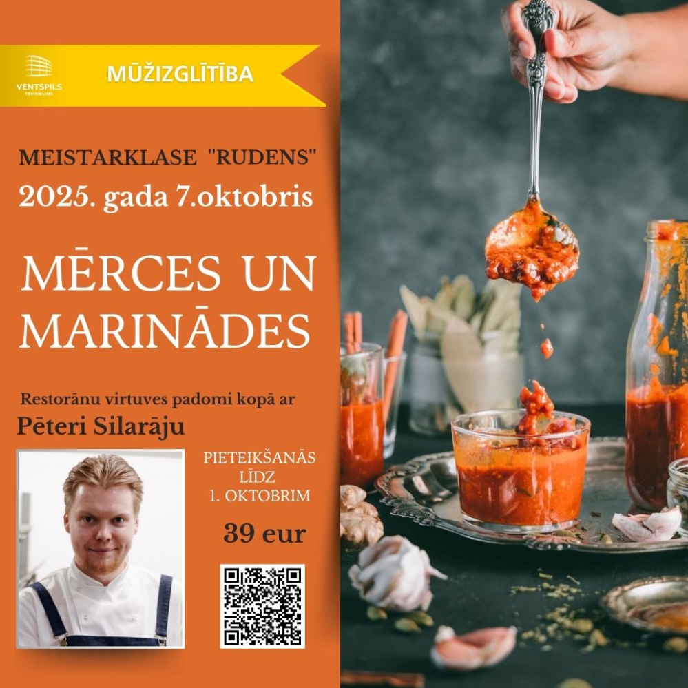 2025. gada 7. oktobrī, plkst. 18.00 Ventspils tehnikumā notiks meistarklases “Mērces un marinādes”, ko vadīs Ventspils tehnikuma pasniedzējs un restorāna “Strauss un kaza” šefpavārs Pēteris Silarājs. Mērce bieži vien ir tas elements, kas ēdienam piešķir īpašu noskaņu un izceļ garšas nianses. Tā ir kā slepenā sastāvdaļa, kas vienkāršu maltīti spēj padarīt izsmalcinātāku. Šajā meistarklasē būs iespēja iemācīties gatavot gan pasaulē zināmas klasiskās mērces, gan rudens sezonai piemērotas marinādes, kas ikdienas ēdienam piešķirs pavisam jaunu garšu. Dalībnieki kopā ar šefpavāru Pēteri Silarāju apgūs: Mērces: Diļļu ajoli Bermaise mērce Sarkanvīna demi glace mērce Franču vinegrette salātu mērce Marinādes: Rudens dārzeņu marināde Universālā marināde (marināžu pamatu pamats) Marināde krāsnī gatavotiem putnu gaļas ēdieniem Meistarklases laikā dalībnieki ne tikai apgūs receptes, bet arī uzzinās praktiskus padomus, kā restorānu virtuves paņēmienus izmantot mājās. Meistarklases cena: 39 eiro Cenā ietilpst produkti, kas nepieciešami ēdienu pagatavošanai, profesionāls tehniskais aprīkojums un nepieciešamie palīglīdzekļi (vienreiz lietojamais priekšauts, gumijas cimdi). Pieteikšanās meistarklasei līdz 1. oktobrim, aizpildot anketu – https://forms.gle/zBxf5A5vkFQi63CbA