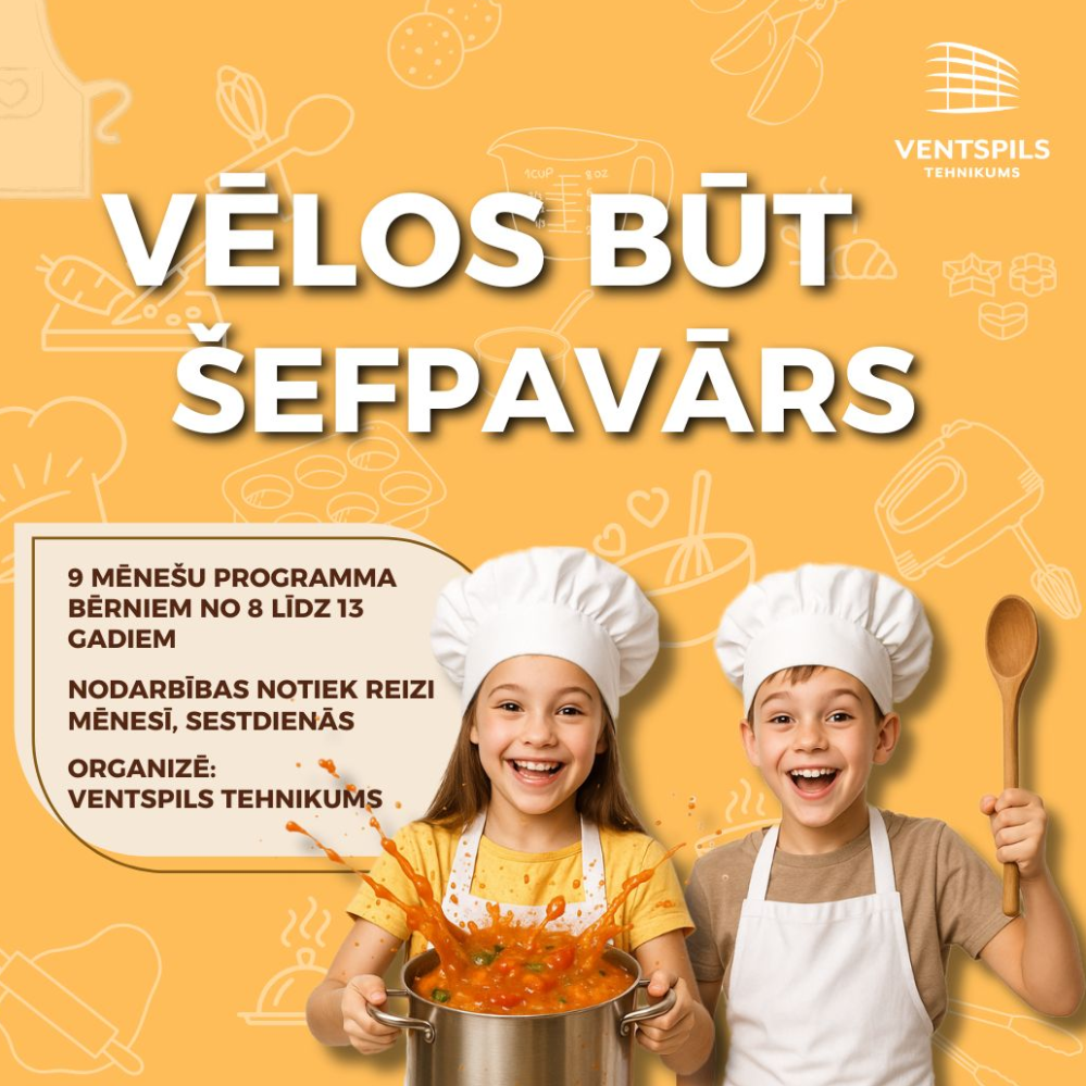 Ventspils tehnikums turpina attīstīt bērnu un jauniešu izglītojošās un radošās brīvā laika pavadīšanas iespējas, piedāvājot unikālu 9 mēnešu programmu “Vēlos būt šefpavārs!”. Programma norisināsies no 2025. gada oktobra līdz 2026. gada jūnijam, un tā paredzēta bērniem vecumā no 8 līdz 13 gadiem. “Vēlos būt šefpavārs!” mērķis ir veicināt bērnu radošumu, zinātkāri un prasmes jēgpilnai brīvā laika pavadīšanai. Nodarbību laikā bērni ne tikai apgūs ēdienu gatavošanas pamatus, bet arī mācīsies sadarboties komandā, izprast sabiedrībā pieņemtās uzvedības normas un kopt savu labjūtību. Nodarbības vadīs Ventspils tehnikuma ēdināšanas un viesmīlības jomas vadošie pedagogi. Programmas norise Nodarbības notiks reizi mēnesī, sestdienās, katrai grupai nodarbība ilgs 3 stundas. Dalībnieki gatavos 2–3 ēdienus atbilstoši nodarbību tēmai un iespējai to mājās patstāvīgi gatavot atkārtoti. Dalībnieki katrā nodarbībā gatavos arī ēdienu papildinošu dzērienu, kā arī veidos atbilstošu galda klājumu un tā noformējumu. Katras nodarbības noslēgumā pagatavotais cienasts tiks baudīts uz vietas vai paņemts līdzi vecākiem. Grupu sadalījums: Bērniem vecumā no 8 līdz 10 gadi nodarbības notiks no plkst. 09.30 līdz 12.30; Bērniem vecumā no 11 līdz 13 gadi nodarbības notiks no plkst. 13.00 līdz 16.00. Katrā grupā 12–13 bērni. Nodarbību tēmas nodarbība – 2025. gada 11. oktobrī – “Saulainā Itālija” – Iepazīsim Itālijas garšu pasauli un gatavosim klasiskus itāļu ēdienus. nodarbība – 2025. gada 8. novembrī – “Svinam Latvijas dzimšanas dienu” – Radīsim svētku galdu ar rudens veltēm un tradicionāliem ēdieniem, godinot Latvijas garšas. nodarbība – 2025. gada 13. decembrī –“Ziemassvētki klāt! – Gatavosim siltus un aromātiskus ēdienus svētku noskaņās, lai radītu īstu Ziemassvētku sajūtu. nodarbība – 2026. gada 10. janvārī – “Sasildīsimies!” – Mācīsimies vārīt gardas zupas un gatavot sildošus karstos dzērienus ziemas vakariem. nodarbība – 2026. gada 7. februārī – Našķosimies! – Cepsim kūkas un gatavosim saldos našķus, kas sagādās prieku gan pašiem, gan mājiniekiem. nodarbība – 2026. gada 14. martā – Gaidām Lieldienas – Radīsim košus un gardus Lieldienu ēdienus, kas iederēsies svētku galdā. nodarbība – 2026. gada 11. aprīlī – Sportojam – Pagatavosim veselīgus un enerģiju dodošus ēdienus, kas piemēroti baudīšanai brīvā dabā. nodarbība – 2026. gada 9. maijā – Māmiņdienu gaidot – Gatavosim īpašus pārsteiguma ēdienus un desertus, lai iepriecinātu mammas svētkos. nodarbība – 2026. gada 5. vai 6. jūnijā – Bērnu ballīte – izlaidums – Noslēgsim programmu ar svinīgu ballītes ēdienu un našķu gatavošanu, radot īstu svētku sajūtu.(Iespējama papildu nodarbība, ja vienojas par tēmu un datumu) Dalības maksa 350 EUR par visu programmu (iekļautas produktu un noformējamam nepieciešamo materiālu izmaksas, kā arī atlīdzības pedagogiem). Apmaksa iespējama: vienā maksājumā līdz pirmajai nodarbībai, vai divos maksājumos (250 EUR līdz pirmajai nodarbībai, 100 EUR līdz trešajai nodarbībai). Maksājumi veicami ar pārskaitījumu. Dalībnieku vecākiem ir iespēja atgūt daļu summas, iesniedzot ikgadējo deklarāciju VID. Pieteikšanās Dalībnieku skaits ir ierobežots! Pieteikties iespējams līdz 5. oktobrim, aizpildot pieteikuma anketu – https://docs.google.com/forms/d/e/1FAIpQLSd_EZPT3xzKIdSqCCW5Ux1I6O3G-HcqAvX-d0q0eyvyqyn-bQ/viewform