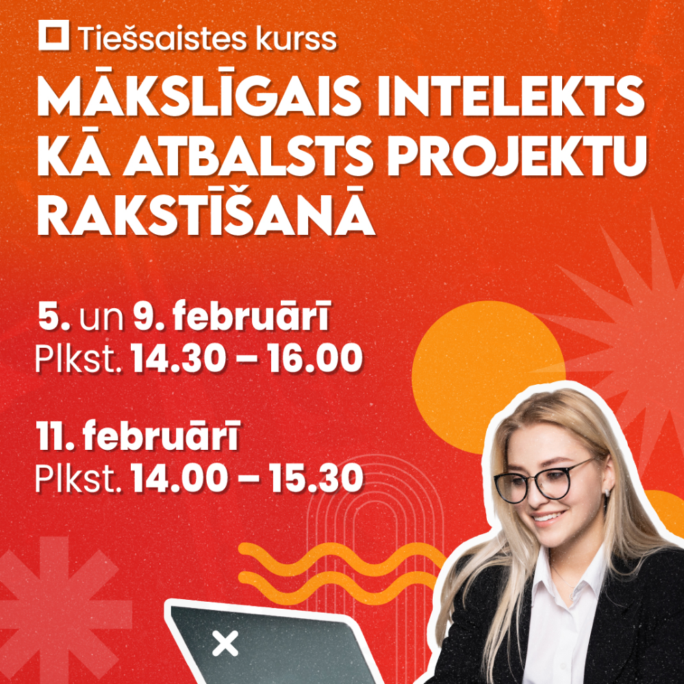 Digitālais centrs aicina piedalīties tiešsaistes kursā “Mākslīgais intelekts kā atbalsts projektu rakstīšanā” Ventspils Digitālais centrs aicina piedalīties apmācībās, kur dalībnieki iegūs praktiskas zināšanas par mākslīgā intelekta (MI) izmantošanu projektu pieteikumu izstrādē un uzlabošanā. Nodarbībās būs iespēja apgūt, kā ar MI palīdzību formulēt projekta ideju, mērķus, aktivitātes un plānotos rezultātus, kā arī veikt teksta kvalitātes kontroli. Tiks apskatīti arī būtiski drošības, ētikas un konfidencialitātes jautājumi, kā arī biežākie riski, strādājot ar MI. Apmācības notiks 5. un 9. februārī plkst. 14.30 – 16.00, 11. februārī plkst. 14.00 – 15.30 tiešsaistes platformā Zoom. Pieteikties apmācībām iespējams līdz 2. februārim, aizpildot anketu šeit: https://adre.se/anketamiprojekti. Apmācību programma: Ievads un attālinātā darba kārtība. kursa mērķi un struktūra, attālinātā darba organizācija; MI kā atbalsta rīks projektu izstrādē. MI pielietojums projektu rakstīšanā: projekta dzīves cikls; MI izmantošanas piemēri dažādos posmos. Drošība, ētika, konfidencialitāte un biežākie riski: datu aizsardzība un konfidencialitāte; biežākie riski un kļūdas, atbildīga MI izmantošana. Projekta plānošana ar MI: aktivitāšu plāns un laika grafiks; komandas lomas, risku identificēšana un vadība. Projekta rezultātu formulēšana: rezultātu formulēšana, indikatori un izvērtēšana; ilgtspējas nodrošināšana. Rediģēšana, kvalitātes kontrole: teksta uzlabošana ar MI, gala kvalitātes pārbaude. Kursa dalībniekiem nepieciešams dators, stabils interneta pieslēgums, kā arī piekļuve Zoom konferenču programmai. Kursu vadīs Vita Vītola-Lapiņa - projektu eksperte, digitālo prasmju speciāliste. Dalības maksa 34,96 EUR. Pēc apmācībām kursa dalībniekiem būs pieejamas kursa prezentācijas. Mācību noslēgumā dalībnieki saņems Ventspils Digitālā centra apliecību. Papildu informācija Ventspils Digitālajā centrā, Akmeņu ielā 3, rakstot uz e-pastu [email protected] vai zvanot pa tālruni 63607607. Aktuālā informācija par Digitālā centra piedāvājumu pieejama sociālajos tīklos Facebook un Instagram @vdcentrs, kā arī mājas lapā www.digitalaiscentrs.lv.