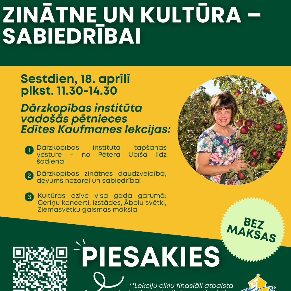 Ventspils Augstskolā turpinās lekciju cikls "Zinātne un kultūra sabiedrībai". Šoreiz dosimies iedvesmojošā ceļojumā dārzkopības pasaulē kopā ar vienu no nozares spožākajām personībām. Lekcijas norisināsies 18. aprīlī plkst. 11.30–14.30 Ventspils Augstskolā, un tās vadīs Dr. biol. Edīte Kaufmane, Dārzkopības institūta vadošā pētniece. Lekciju gaitā iepazīsi šādas tēmas: Dārzkopības institūta tapšanas vēsture – no Pētera Upīša līdz šodienai Dārzkopības zinātnes daudzveidība, devums nozarei un sabiedrībai Kultūras dzīve visa gada garumā: Ceriņu koncerti, izstādes, Ābolu svētki, Ziemasvētku gaismas māksla Nāc un uzzini vairāk par Latvijas dārzu dārgumiem un zinātnes lomu to saglabāšanā! Pieteikšanās: https://venta.lv/muzizglitiba/pieteiksanas/ Papildu informācija: [email protected]