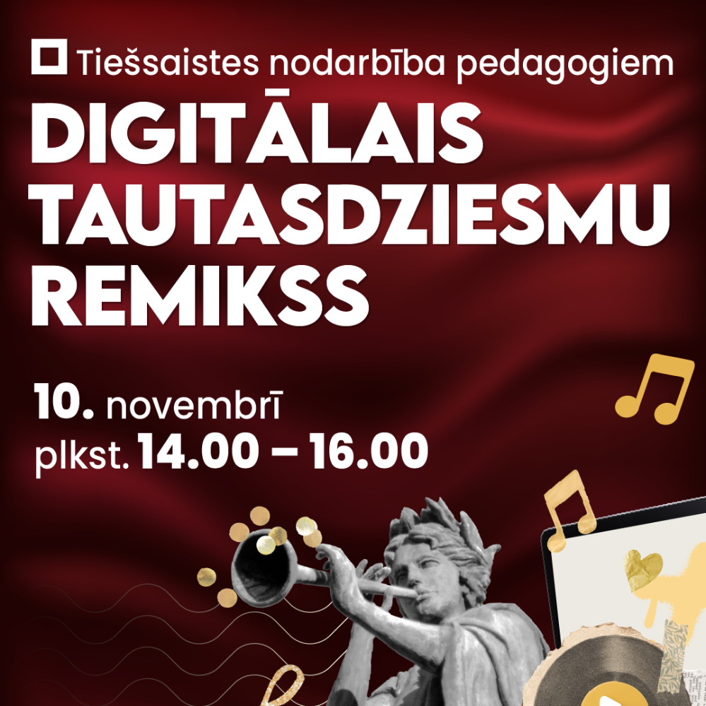 Digitālais centrs aicina pedagogus piedalīties tiešsaistes nodarbībā “Digitālais tautasdziesmu remikss” Ventspils Digitālais centrs aicina klašu audzinātājus, mūzikas un literatūras skolotājus piedalīties radošā tiešsaistes nodarbībā, kas palīdzēs sagatavoties interesantai mācību stundai Latvijas valsts svētku tematikā. Nodarbības dalībnieki izveidos mūsdienīgu tautasdziesmas interpretāciju, izmantojot digitālus mūzikas radīšanas rīkus. Nodarbība notiks 10. novembrī plkst. 14.00 – 16.00 tiešsaistes platformā Zoom. Pieteikties iespējams līdz 7. novembrim, aizpildot anketu šeit: www.adre.se/remikssanketa. Šajā nodarbībā skolotāji apgūs, kā iedvesmot skolēnus veidot mūsdienīgu tautasdziesmu interpretāciju digitālajā vidē, izmantojot vienkāršus un pieejamus tiešsaistes rīkus, piemēram, BandLab, Beepbox u.c., kā arī iegūs gatavu uzdevumu, kuru izmantot Latvijas valsts svētku nedēļā. Iegūtās zināšanas palīdzēs dažādot mācību procesu un veicinās skolēnus izprast un novērtēt latviešu tautasdziesmas, vienlaikus attīstot digitālās prasmes, muzikālo domāšanu un radošo pašizpausmi. Nodarbības dalībniekiem nepieciešams dators ar stabilu interneta pieslēgumu, Google konts un piekļuve tiešsaistes platformai Zoom. Nodarbību vadīs Ģirts Edvarts Stepiņš, kurš ieguvis maģistra grādu Jauno mediju mākslā un ir pasniedzējs Ventspils Digitālajā centrā un Liepājas Universitātē. Maksa par kursu ir 9,60 EUR. Mācību noslēgumā dalībnieki saņems Ventspils Digitālā centra apliecību. Papildu informācija Ventspils Digitālajā centrā, Akmeņu ielā 3, rakstot uz e-pastu [email protected] vai zvanot pa tālruni 63607607. Aktuālā informācija par Digitālā centra piedāvājumu pieejama sociālajos tīklos Facebook un Instagram @vdcentrs, kā arī mājas lapā www.digitalaiscentrs.lv.