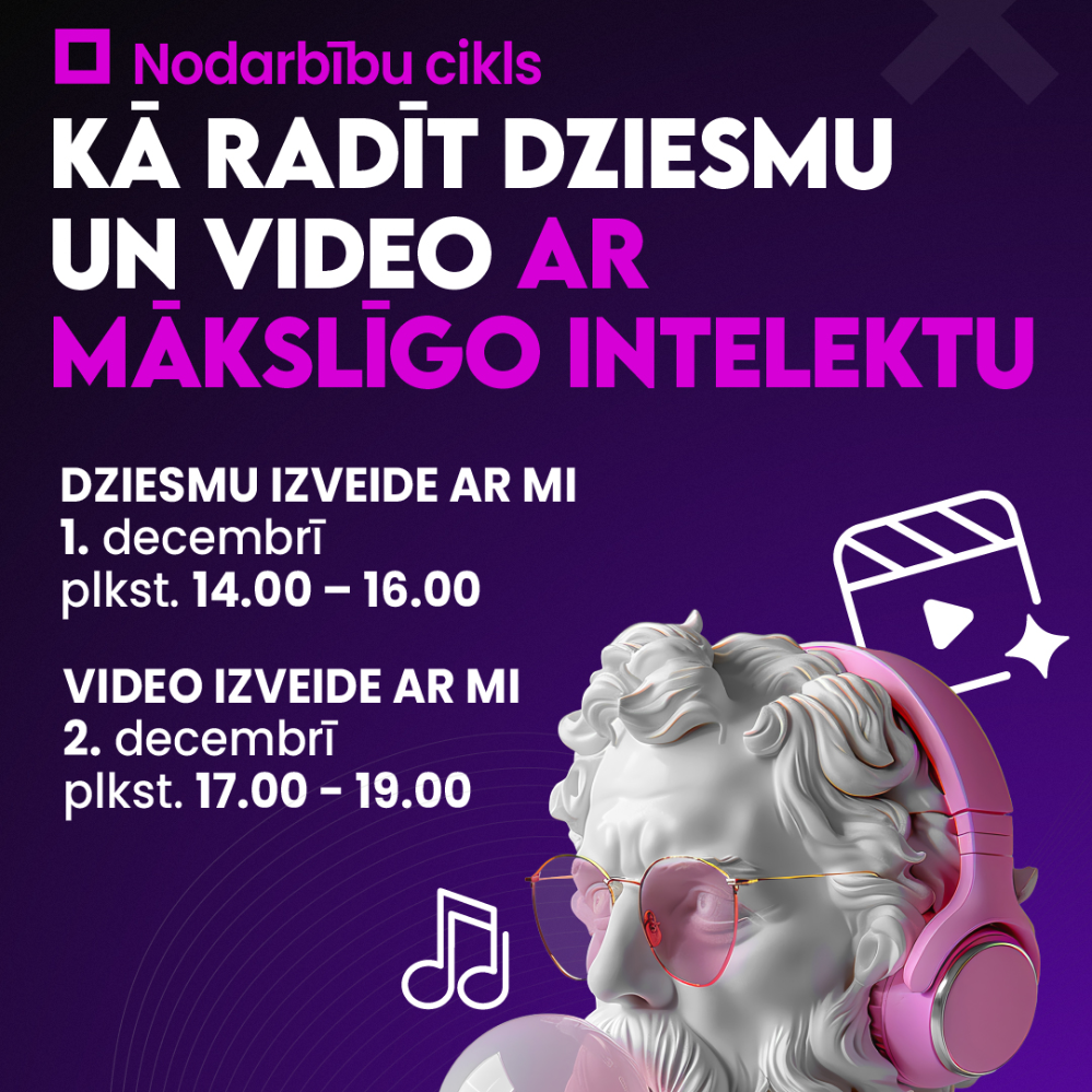 Digitālais centrs piedāvā tiešsaistes nodarbību ciklu“Kā radīt dziesmu un video ar mākslīgo intelektu” Ventspils Digitālais centrs aicina ikvienu interesentu piedalīties nodarbībās, kur būs iespēja apgūt dziesmu un video izveidi ar mākslīgā intelekta (MI) rīkiem. Dalībnieki uzzinās, kā no idejas soli pa solim izveidot dziesmas tekstu, melodijas prototipu un vizuālu stāstu video formātā. Apmācības būs piemērotas ikvienam, kurš vēlas iepazīt mūsdienīgus digitālos rīkus un izveidot radošu un oriģinālu pārsteigumu ģimenei, draugiem, kolēģiem vai skolēniem. Nodarbības notiks tiešsaistes platformā Zoom: decembrī plkst. 14.00 – 16.00 “Dziesmu veidošana ar MI”. 2. decembrī plkst. 17.00 – 19.00 “Video veidošana ar MI”. Pieteikties iespējams līdz 28. novembrim, aizpildot anketu šeit: www.adre.se/anketamidziesmasunvideo. Dalībniekiem ir iespēja pieteikties arī vienai nodarbībai. Nodarbību laikā dalībnieki apgūs: efektīvu MI uzdevumu (promptu) veidošanu un lietošanu kvalitatīvu rezultātu iegūšanai; MI izmantošanu video radīšanā – no teksta un melodijas līdz aranžējumam un vizuālajai kompozīcijai, kā arī īsu video sociālajiem tīkliem vai izglītojošiem materiāliem izveidi. MI izmantošanu dziesmas teksta un melodijas izveidē. populāru MI rīku, piemēram, Suno, Udio, ChatGPT, Soundraw, Mubert, Canva, HeyGen u.c. izmantošanu praktiskos piemēros. Kursa dalībniekiem nepieciešams dators, stabils interneta pieslēgums, aktīvs Google konts, kā arī piekļuve Zoom konferenču programmai. Nodarbību “Dziesmu izveide ar MI” vadīs Ģirts Edvarts Stepiņš, kurš ieguvis maģistra grādu Jauno mediju mākslā un ir pasniedzējs Ventspils Digitālajā centrā un Liepājas Universitātē. Savukārt nodarbību “Video izveide ar MI” vadīs Dace Kamela - Ventspils Digitālā centra pasniedzēja ar 20 gadu pieredzi grafiskajā dizainā un maģistra grādu ekonomikā, pedagoģijā un vēsturē. Dalības maksa par vienu nodarbību ir 9,60 EUR, bet par abām 19,20 EUR. Mācību noslēgumā dalībnieki saņems Ventspils Digitālā centra apliecību. Ja kursa dalībniekam nebūs iespēja pievienoties kādai no tiešsaistes nodarbībām, tad nodarbības ierakstus un mācību materiālus būs iespēja apskatīt Ventspils Digitālā centra mācību platformā, kur tie būs pieejami 6 mēnešus, lai dalībnieki jebkurā laikā varētu atsvaidzināt zināšanas par apgūto Papildu informācija Ventspils Digitālajā centrā, Akmeņu ielā 3, rakstot uz e-pastu [email protected] vai zvanot pa tālruni 63607607. Aktuālā informācija par Digitālā centra piedāvājumu pieejama sociālajos tīklos Facebook un Instagram @vdcentrs, kā arī mājas lapā www.digitalaiscentrs.lv.
