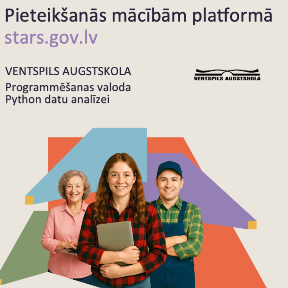 Saņem 500 eiro un mācies “Python” datu analīzei! Ventspils Augstskola platformā stars.gov.lv aicina pieaugušos apgūt studiju kursu “Programmēšanas valoda “Python” datu analīzei”. Platformā stars.gov.lv, izmantojot savu individuālo mācību kontu (IMK), pieaugušajiem vecumā no 18 gadiem tiek piešķirts finansējums 500 eiro apmērā. Ventspils Augstskola piedāvā iespēju apgūt studiju kursu “Programmēšanas valoda “Python” datu analīzei”, jo “Python” ir viena no populārākajām un vieglāk apgūstamajām programmēšanas valodām pasaulē. Tā tiek plaši izmantota uzņēmumos, pētniecībā un valsts pārvaldē datu apstrādei aun analīzei. Ar tās palīdzību iespējams apkopot, sakārtot un analizēt datus, izveidot pārskatus un pieņemt pamatotus lēmumus. Mācības notiks darba dienu vakaros, attālināti, un tās tiks uzsāktas 2026. gada 2. februārī. Pieteikšanās: https://stars.gov.lv/programma/223