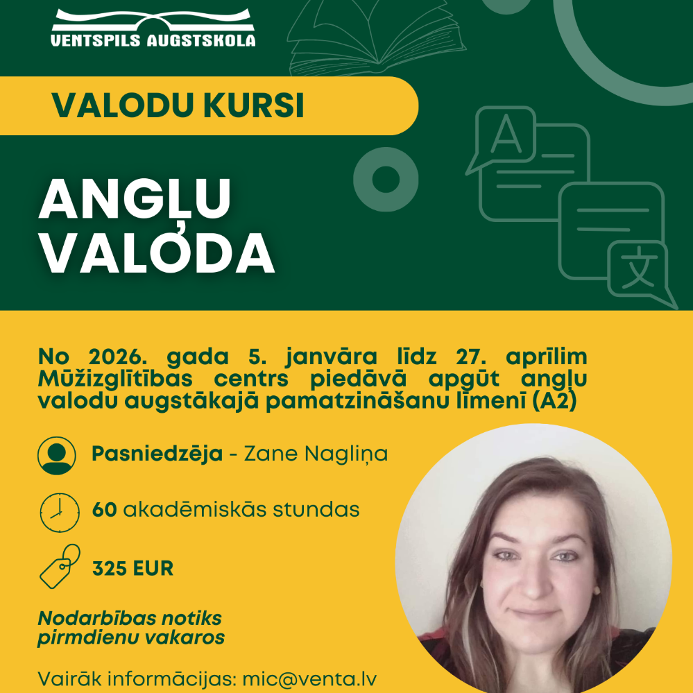 No 5. janvāra aicinām pievienoties angļu valodas kursiem pie pasniedzējas Zanes Nagliņas. Kurss paredzēts apguvējiem ar pamatzināšanām, kuri vēlas nostiprināt un paplašināt savas angļu valodas prasmes ikdienas saziņai, un palīdzēs uzlabot runas, klausīšanās, lasīšanas un rakstīšanas prasmes draudzīgā un atbalstošā mācību vidē. Nodarbības notiks pirmdienās plkst. 18.00–21.00. Par docētāju Angļu valodas pasniedzēja Zane Nagliņa ir guvusi plašu pieredzi angļu valodas mācīšanā, strādājot ar dažādām vecuma grupām un zināšanu līmeņiem. Ilgu laiku dzīvojusi Lielbritānijā, kur absolvējusi universitāti un ieguvusi starptautiski atzīto angļu valodas mācīšanas sertifikātu CELTA. Pēc atgriešanās Latvijā Zane turpina attīstīt profesionālo darbību valodu apmācībā, piedāvājot strukturētas un mūsdienīgas nodarbības. Ikdienā pasniedzējas intereses saistītas ar raidierakstu klausīšanos, grāmatu lasīšanu un ceļošanu pa Latviju, kas iedvesmo arī mācību saturu un pieeju nodarbībās.