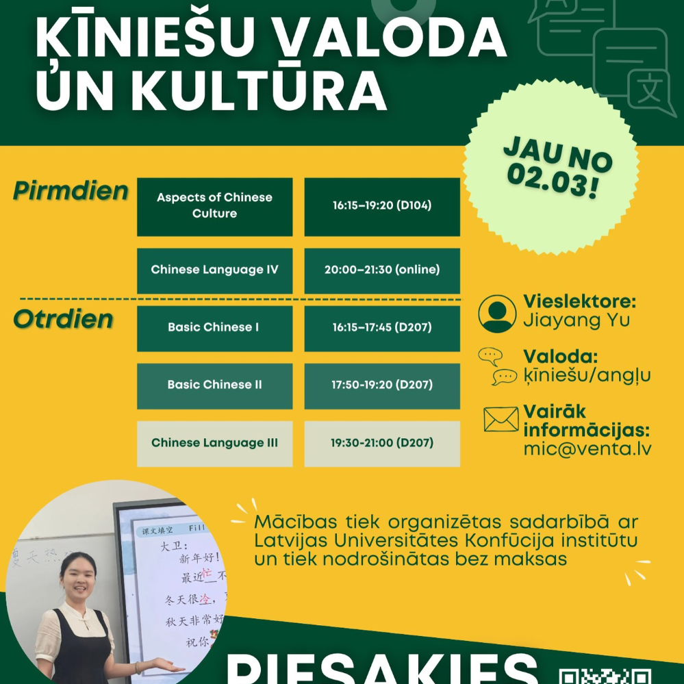Apgūsti ķīniešu valodu un kultūru! Ventspils Augstskolas Mūžizglītības centrs aicina no 2. marta līdz 27. aprīlim (izņemot 6. aprīli) apgūt ķīniešu valodu un kultūru gan iesācējus, gan interesentus ar jau esošām priekšzināšanām. Kursus vadīs vieslektore no Ķīnas Jiayang Yu. Pirmdienās: 16.15–19:20 Ķīnas kultūras aspekti (auditorija D104) 20:00–21:30 Ķīniešu valoda, 4. līmenis (tiešsaiste) Otrdienās: 16.15–17.45 Ķīniešu valoda, 1. līmenis (auditorija D207) 17.50–19.20 Ķīniešu valoda, 2. līmenis (auditorija D207) 19:30–21:00 Ķīniešu valoda, 3. Līmenis (auditorija D207) Ķīniešu valodas apguve notiek ķīniešu un angļu valodā. Mācības tiek organizētas sadarbībā ar Latvijas Universitātes Konfūcija institūtu un tiek nodrošinātas bez maksas. Pieteikšanās: https://www.venta.lv/muzizglitiba/pieteiksanas Vairāk informācijas: [email protected].