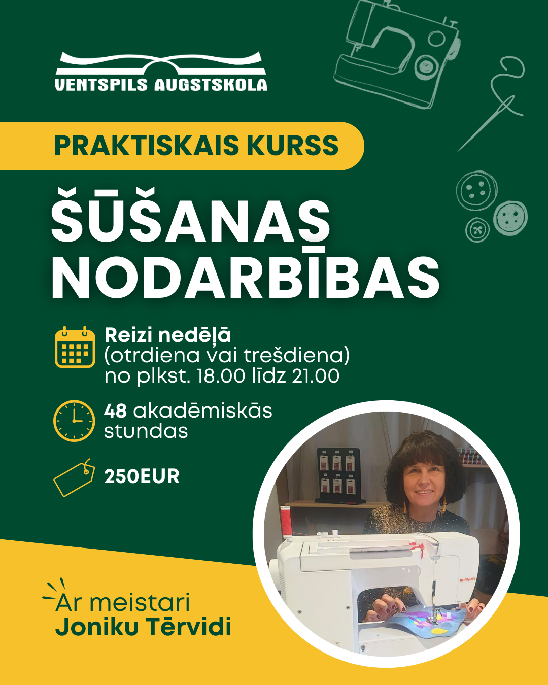 Ventspils Augstskolas Mūžiglītības centrs aicina apgūt šūšanu pie meistares Jonikas Tērvides, nodarbības paredzētas reizi nedēļā (otrdiena vai trešdiena) no plkst. 18.00 līdz 21.00. Lai vairāk uzzinātu par šo iespēju un iepazītos ar pasniedzēju 15. septembrī plkst. 18.00 paredzēta bezmaksas informatīvā nodarbība.