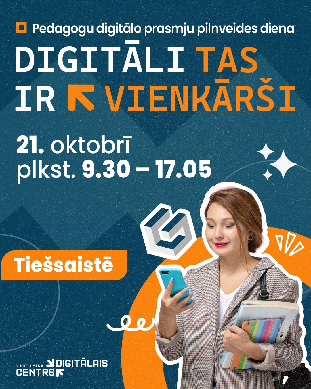 Pedagogu digitālo prasmju pilnveides diena “Digitāli – tas ir vienkārši!” notiks rudens brīvlaikā - 21. oktobrī plkst. 9.30 – 17.05 tiešsaistes platformā Zoom. Pieteikties iespējams līdz 15. oktobrim, aizpildot anketu: www.adre.se/anketapedagogudiena2025.