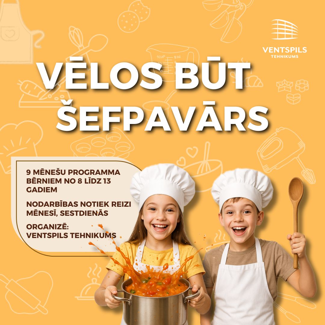 Ventspils tehnikums turpina attīstīt bērnu un jauniešu izglītojošās un radošās brīvā laika pavadīšanas iespējas, piedāvājot unikālu 9 mēnešu programmu “Vēlos būt šefpavārs!”. Programma norisināsies no 2025. gada oktobra līdz 2026. gada jūnijam, un tā paredzēta bērniem vecumā no 8 līdz 13 gadiem.