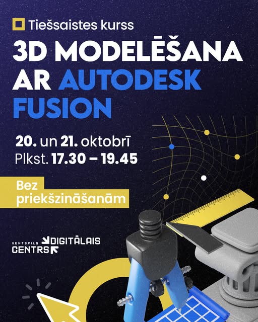 Ventspils Digitālais centrs aicina ikvienu interesentu piedalīties apmācībās un gūt ieskatu Autodesk Fusion vidē, kas sniedz iespēju uzzīmēt un sagatavot reālai izgatavošanai jebkādu priekšmetu – no rotaļlietas līdz mēbelei. Tāpat ar šo programmu ir iespēja sagatavot projektu lāzergravēšanai vai drukāšanai ar 3D printeri. Dalībnieki apgūs, kā veidot 2D skices, pārvērst tās 3D objektos, izmantos pamatfunkcijas un parametrisko pieeju.