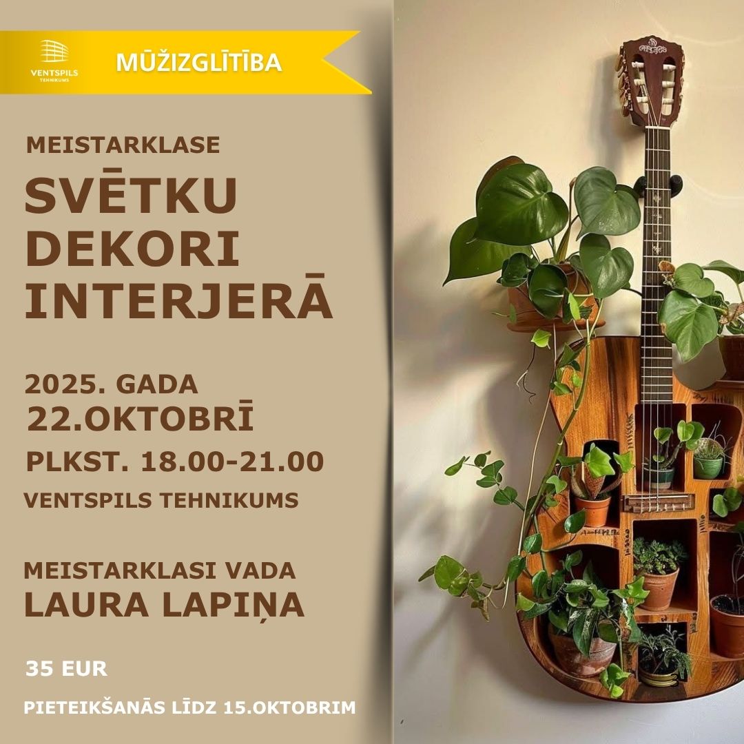 2025. gada 22. oktobrī, plkst. 18.00 Ventspils tehnikumā norisināsies meistarklase “Svētku dekori interjerā”, kuru vadīs dekoratore Laura Lapiņa.