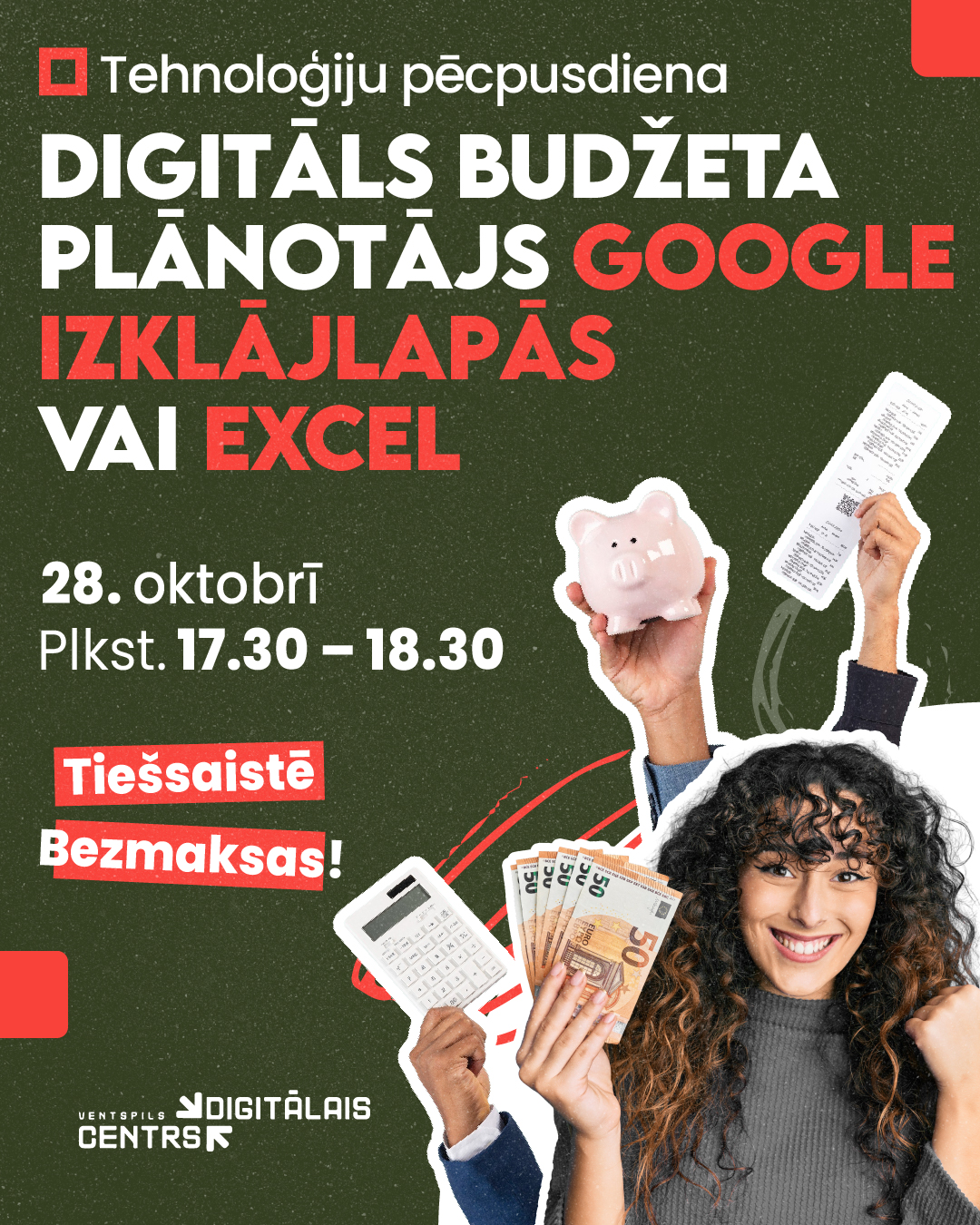 Ventspils Digitālais centrs aicina uz tiešsaistes pasākumu, kurā varēs bez maksas apgūt praktiskas digitālās prasmes savu finanšu pārvaldībai. Dalībnieki iepazīs digitālos budžeta plānotājus, izmantos esošās sagataves, pielāgos tās savām vajadzībām, kā arī mācīsies pielietot formulas, filtrus un diagrammas, lai ērtāk sekotu līdzi ienākumiem un izdevumiem.
