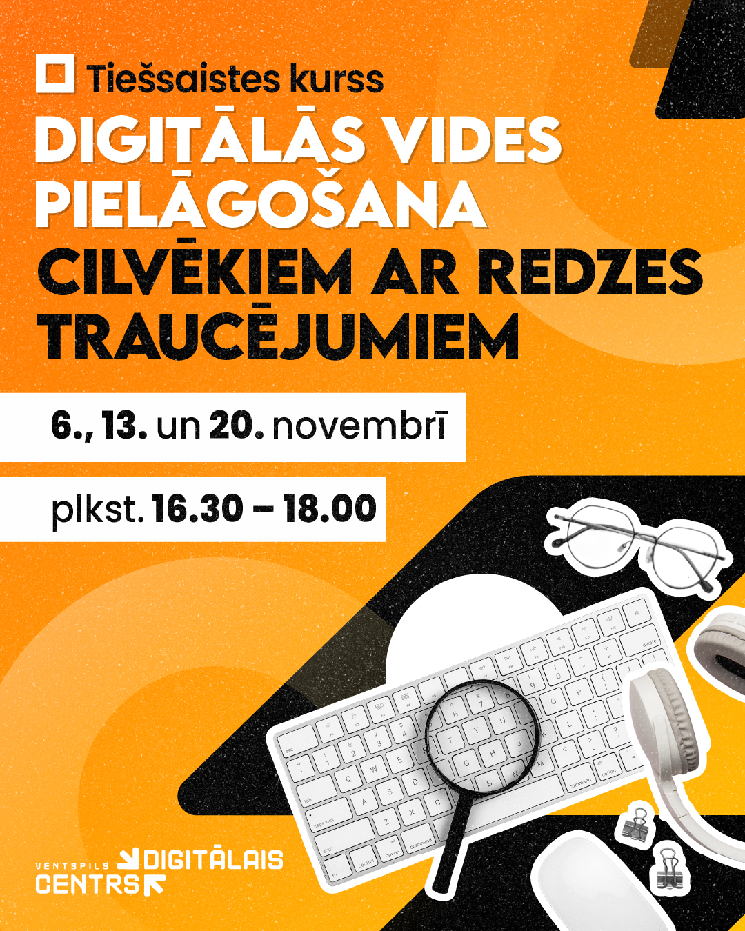Lai veicinātu digitālās vides pieejamību, Digitālais centrs aicina bibliotekārus, pašvaldību un valsts iestāžu darbiniekus, pedagogus un ikvienu citu, kurš ikdienā palīdz cilvēkiem izmantot e-pakalpojumus vai strādāt pie datora, apgūt tiešsaistes kursu “Digitālās vides pielāgošana cilvēkiem ar redzes traucējumiem”. Mācību laikā dalībnieki iegūs praktiskas zināšanas un prasmes, kā pielāgot datoru, viedtālruni un tiešsaistes vidi dažādām redzes vajadzībām.