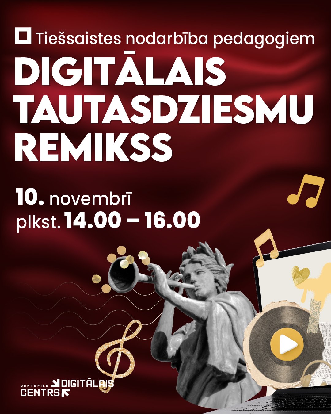 Ventspils Digitālais centrs aicina klašu audzinātājus, mūzikas un literatūras skolotājus piedalīties radošā tiešsaistes nodarbībā, kas palīdzēs sagatavoties interesantai mācību stundai Latvijas valsts svētku tematikā. Nodarbības dalībnieki izveidos mūsdienīgu tautasdziesmas interpretāciju, izmantojot digitālus mūzikas radīšanas rīkus.