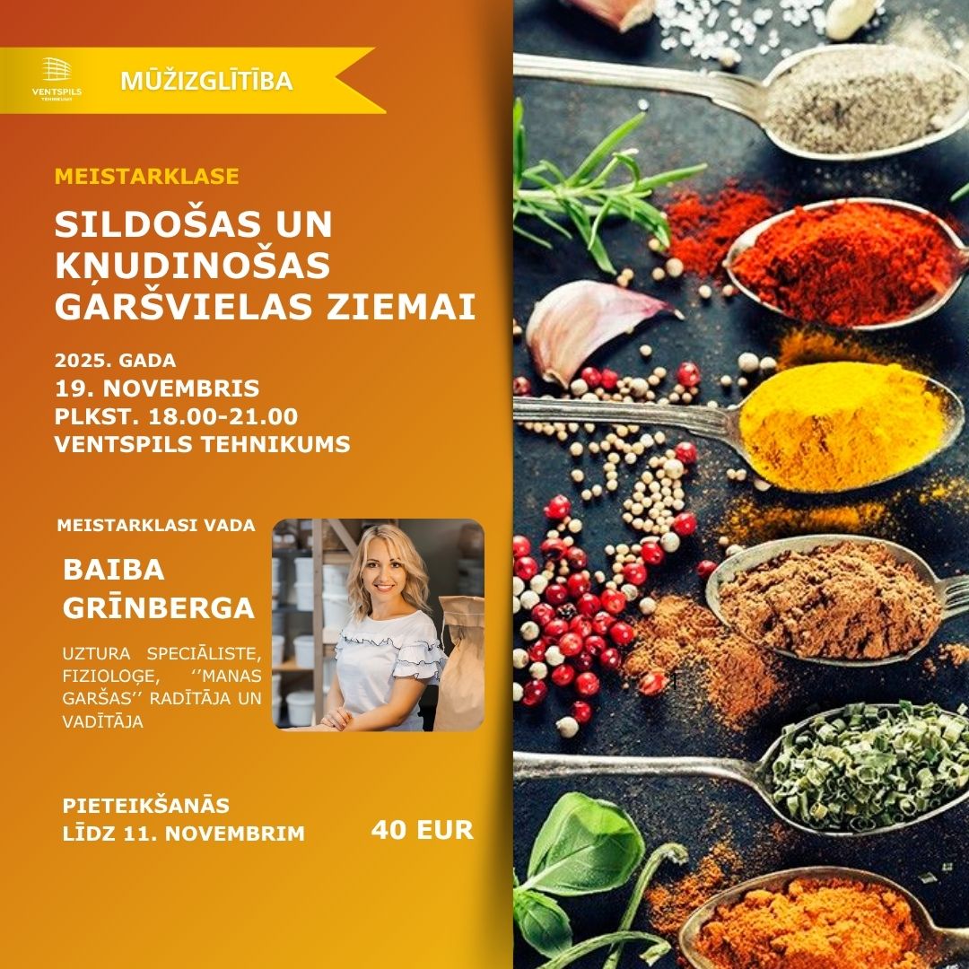 Ventspils tehnikums 2025. gada 19. novembrī plkst. 18.00 aicina uz praktisku un aromātiem bagātu meistarklasi “Sildošas un kņudinošas garšvielas ziemai”, ko vadīs Baiba Grīnberga – uztura speciāliste, fizioloģe, “Manas Garšas” radītāja un vadītāja.
