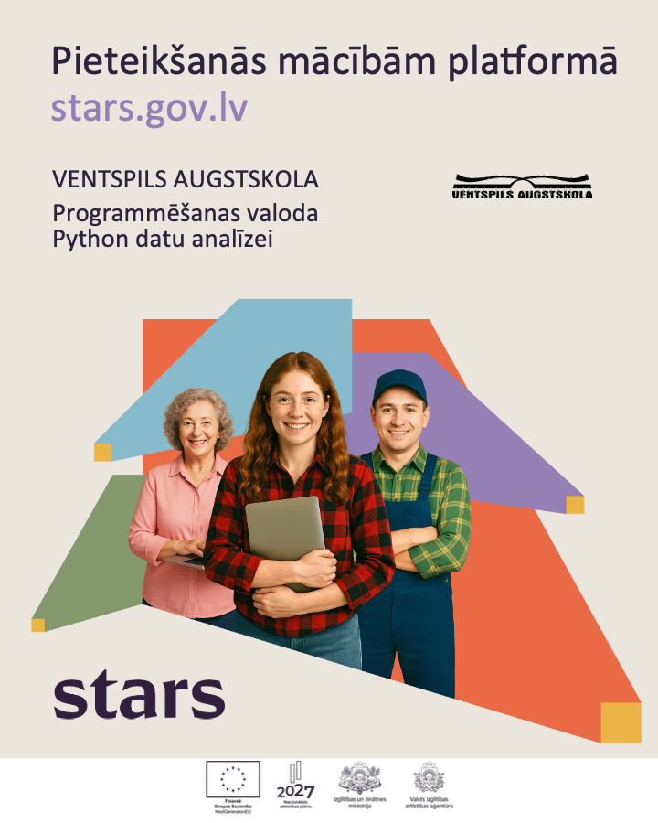 Ventspils Augstskola platformā stars.gov.lv aicina pieaugušos apgūt studiju kursu “Programmēšanas valoda “Python” datu analīzei”.