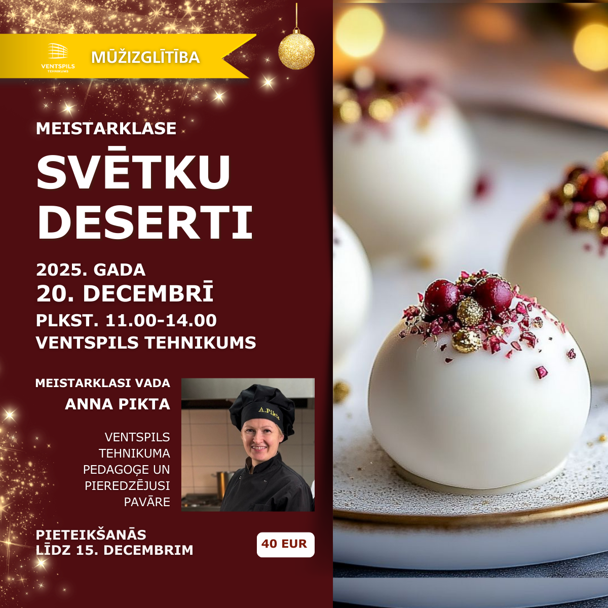 Ventspils tehnikums 2025. gada 20. decembrī plkst. 11.00 aicina uz meistarklasi “Svētku deserti”, ko vadīs Ventspils tehnikuma pedagoģe un pieredzējusi pavāre Anna Pikta.