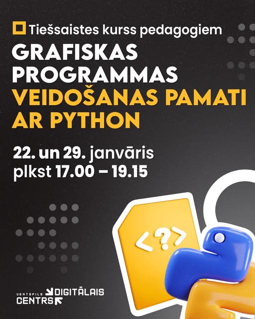 Ventspils Digitālais centrs aicina pedagogus, kuri pasniedz programmēšanas priekšmetus, apgūt teorētiskas un praktiskas iemaņas grafisku Python programmu veidošanā, izmantojot Tkinter bibliotēku. Apmācību dalībnieki iemācīsies izprast Python bibliotēku būtību, atrast un uzstādīt bibliotēkas, lietot dokumentāciju, kā arī apgūs saskarnes pamatus un izveidos grafisku programmu ar interaktīviem elementiem.