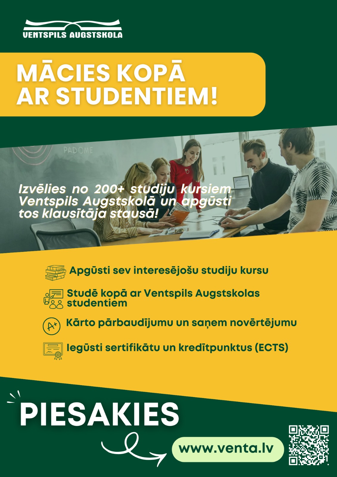 Jau vairākus gadus Ventspils Augstskola aicina cilvēkus, kuriem ir vidējā vai augstākā izglītība, kopā ar studentiem apgūt kādu augstskolā realizēto studiju kursu – ikviens tiek aicināts kaut uz īsu brītiņu iejusties Ventspils Augstskolas studenta ādā, apgūt izvēlēto studiju kursu, kārtot pārbaudījumu, iegūt novērtējumu un saņemt Ventspils Augstskolas izsniegtu sertifikātu par kredītpunktu apguvi. 2026. gada pavasara semestra piedāvājumā atrodami teju 200 studiju kursi.