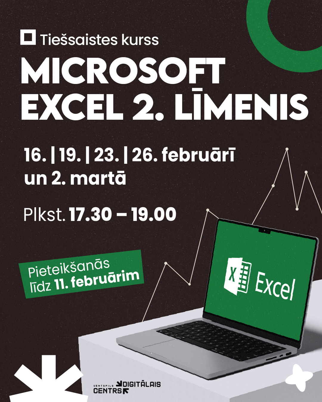 Mūsdienās prasme strādāt ar datiem ir nozīmīga gandrīz jebkurā profesijā, tāpēc Ventspils Digitālais centrs aicina piedalīties kursā, kur būs iespēja apgūt padziļinātas prasmes darbam ar programmatūru MS Excel. Kursa dalībnieki iepazīs dažādas funkcijas un formulas, apgūs efektīvu datu filtrēšanu, veidos diagrammas un strādās ar rakurstabulām. Iegūtās zināšanas palīdzēs strādāt pārliecinošāk un ietaupīt laiku ikdienas uzdevumos.