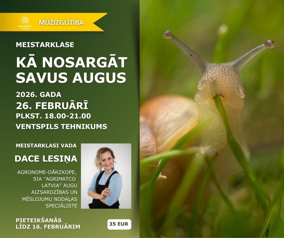 2026. gada 26. februārī no plkst. 18.00 līdz 21.00 Ventspils tehnikumā notiks kursa cikla “IR KUR AUGT” meistarklase dārzkopjiem “Kā nosargāt savus augus?!”. Meistarklasi vadīs Dace Lesiņa, agronome–dārzkope un SIA “Agrimatco Latvia”* augu aizsardzības un mēslojumu nodaļas speciāliste.
