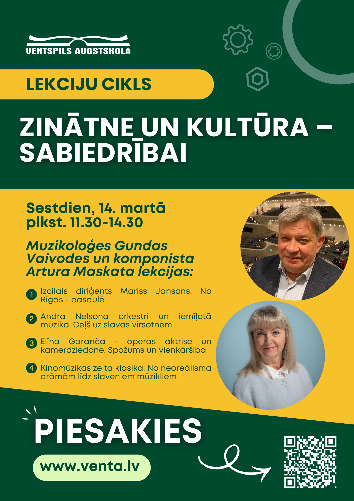 Ar lekciju uzstāsies muzikoloģe Gunda Vaivode un komponists Arturs Maskats, piedāvājot klausītājiem padziļinātu un iedvesmojošu ieskatu mūzikas pasaulē.