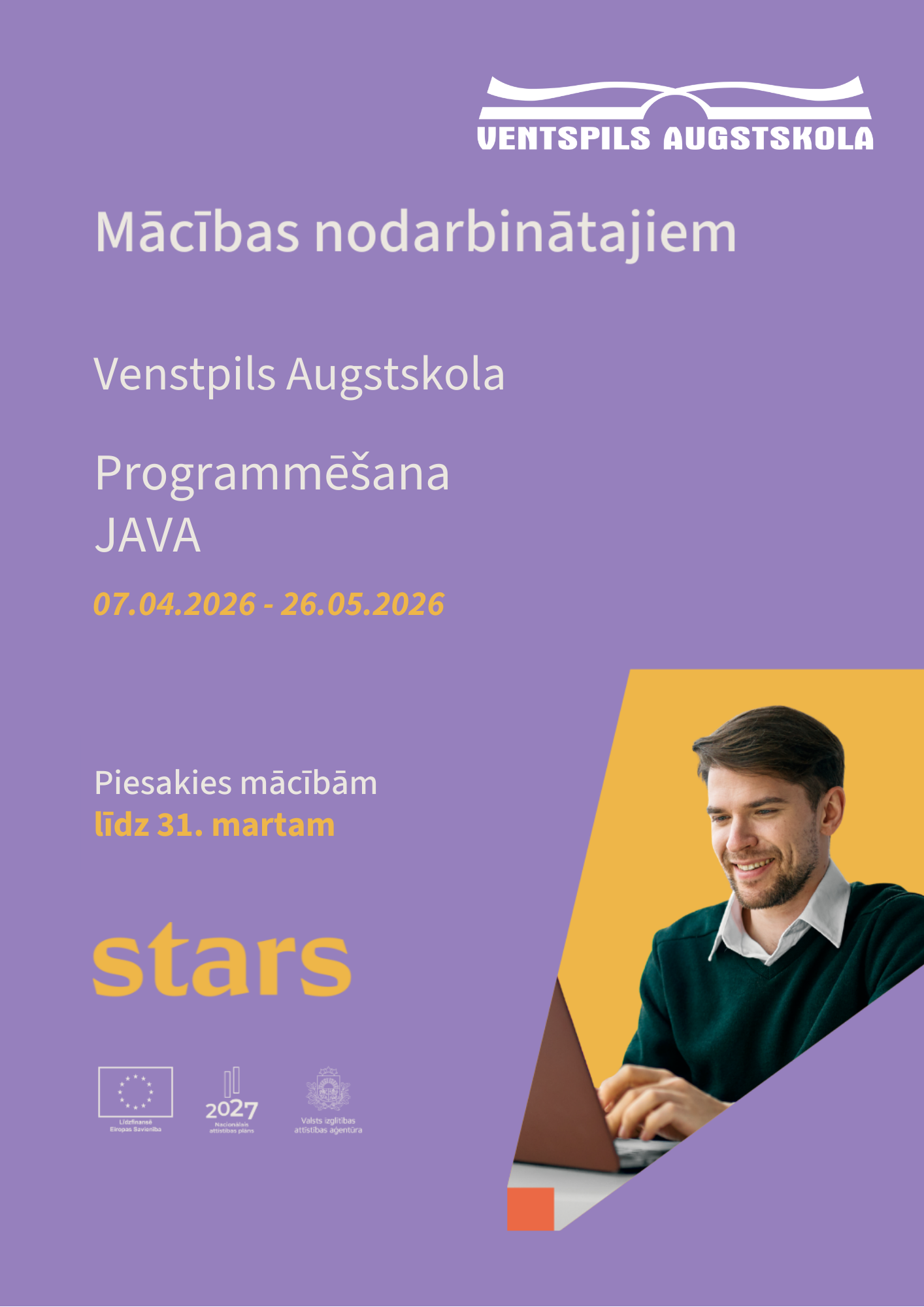 Ventspils Augstskola aicina interesentus pilnveidot digitālās prasmes un pieteikties Java programmēšanas kursam prasmju pilnveides platformā Stars. Šis kurss ir īpaši pieprasīts mūsdienu darba tirgū un sniedz stabilus pamatus turpmākai profesionālajai attīstībai IT nozarē.