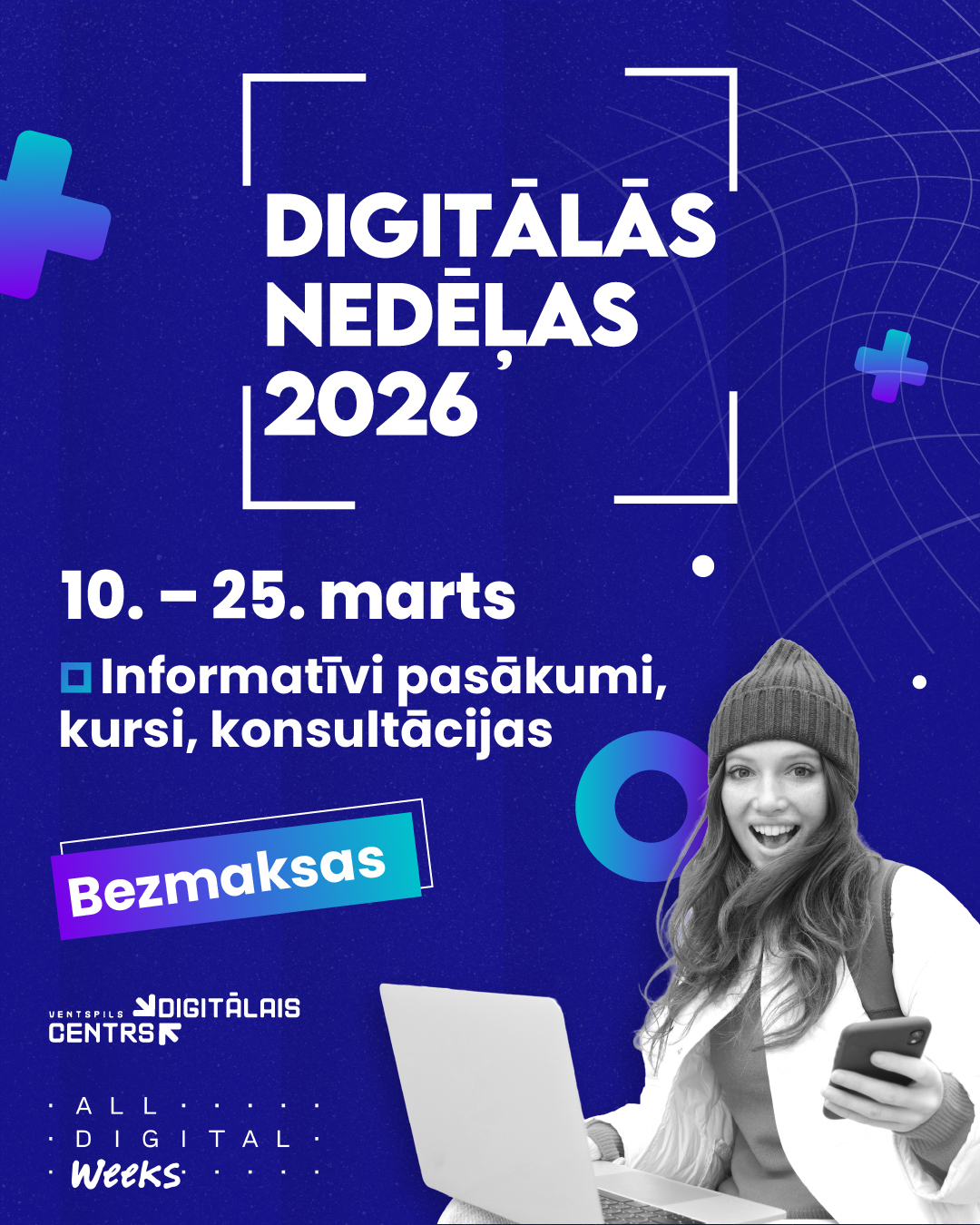 Ventspils Digitālais centrs aicina iedzīvotājus iesaistīties ikgadējā kampaņā “Digitālās nedēļas 2026”, kas sniedz iespēju bez maksas piedalīties dažādās izglītojošās nodarbībās un semināros. Šogad Digitālais centrs piedāvās uzzināt vairāk par drošības riskiem, ar kuriem bērni un jaunieši var saskarties digitālajā vidē, atkārtot ceļu satiksmes noteikumus, uzzināt, kā reģistrēt bērnu izvēlētajā Ventspils skolā, kā arī noskaidrot dažādus interesējošus jautājumus par savu datoru un viedierīcēm.