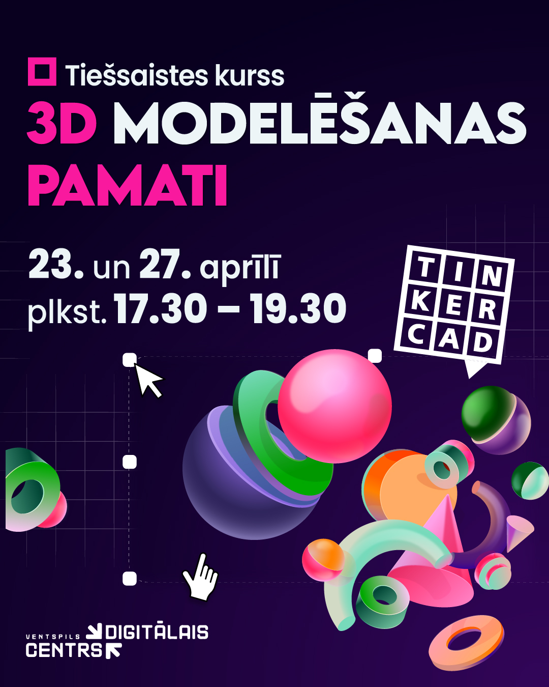 Ventspils Digitālais centrs aicina ikvienu interesentu piedalīties apmācībās, kur būs iespēja apgūt trīsdimensiju modelēšanas pamatus, izmantojot populāro tiešsaistes rīku Tinkercad. Kursā dalībnieki soli pa solim iepazīsies ar 3D modelēšanas pamatprincipiem, iemācīsies veidot vienkāršus trīsdimensiju objektus, apgūs darbu ar ģeometriskām formām un rīkiem, kā arī gūs izpratni par to, kā sagatavot modeļus izmantošanai 3D drukā.
