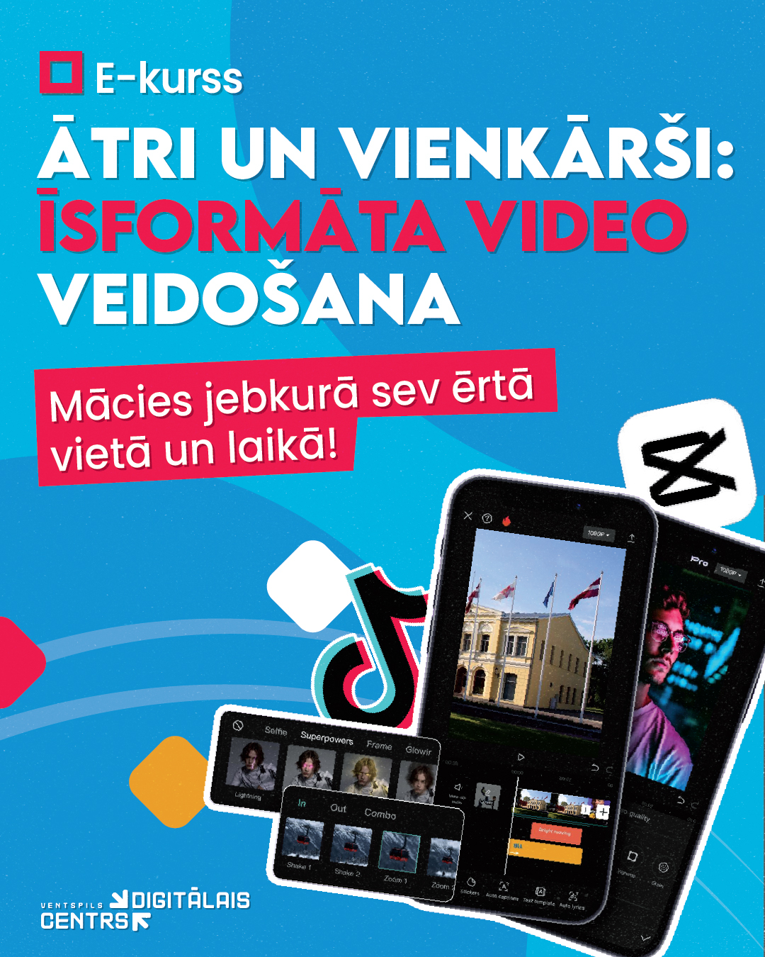 Ventspils Digitālais centrs aicina ikvienu interesentu apgūt e-kursu, kurā praktiskā veidā tiks parādīts, kā ātri izveidot pievilcīgu un auditorijai saprotamu video saturu TikTok, Instagram un Facebook, kā arī iekšējai saziņai organizācijā, skolā vai kolektīvā, piemēram, informācijas nodošanai kolēģiem, aktivitāšu atspoguļošanai vai iestādes ikdienas dokumentēšanai.