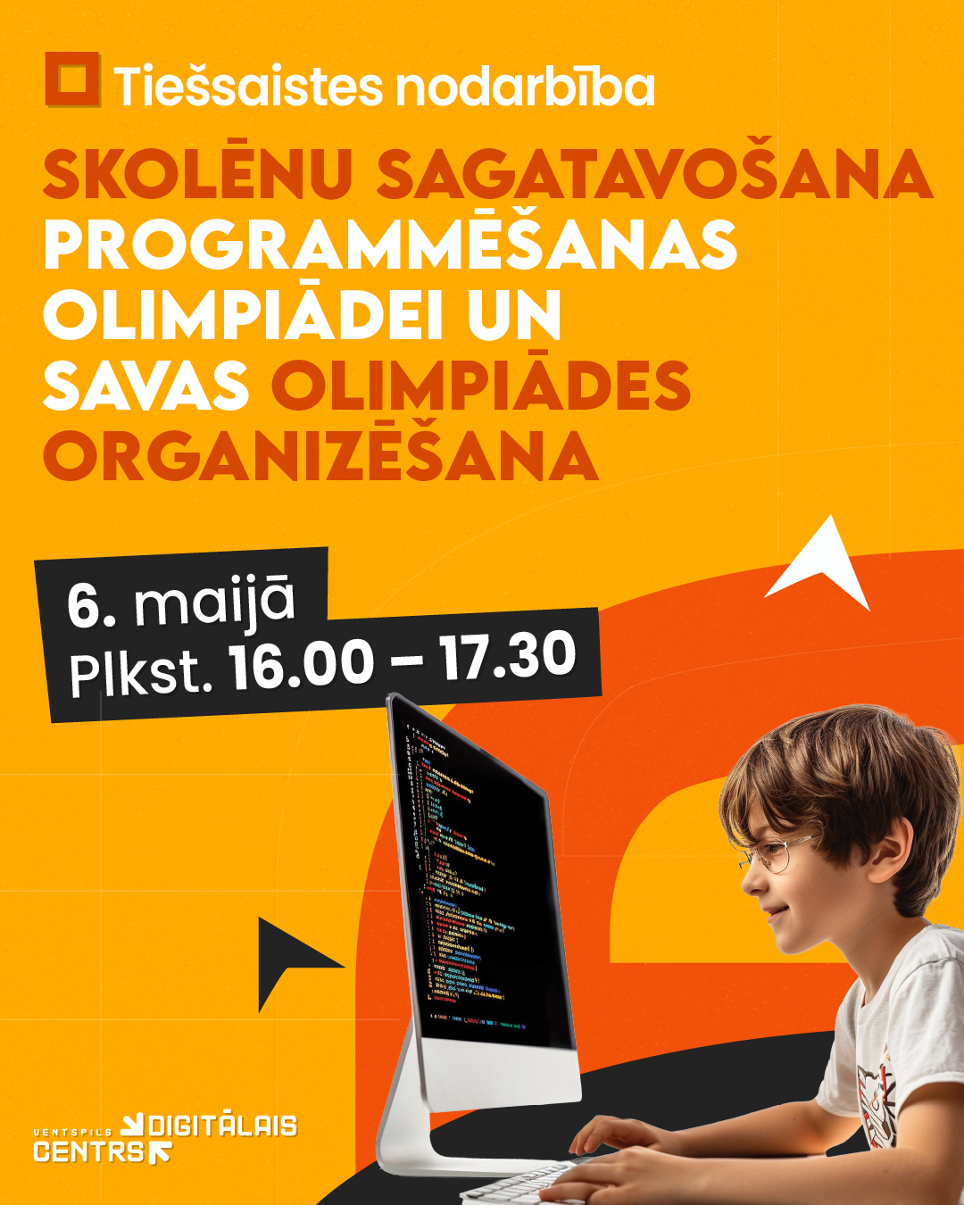 Ventspils Digitālais centrs ir sagatavojis tiešsaistes nodarbību, uz kuru aicināts ikviens pedagogs, kurš vēlas pilnveidot zināšanas par skolēnu sagatavošanu programmēšanas olimpiādēm un konkursiem. Nodarbībā būs iespēja gūt praktisku un strukturētu ieskatu uzdevumu veidos, to sarežģītības līmeņos, vērtēšanas principos, kā arī efektīvās pieejās algoritmiskās domāšanas un problēmu risināšanas prasmju attīstīšanai.