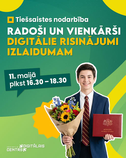 Tuvojoties izlaidumu laikam, Ventspils Digitālais centrs aicina pedagogus, vecākus, skolēnus un ikvienu citu interesentu uz praktisku nodarbību, kurā būs iespēja apgūt, kā ar mūsdienīgiem digitālajiem rīkiem ātri un kvalitatīvi izveidot izlaidumam nepieciešamos materiālus - no personalizētiem digitāliem apsveikumiem un oriģinālām dāvanu idejām līdz pat strukturētai gada grāmatai.