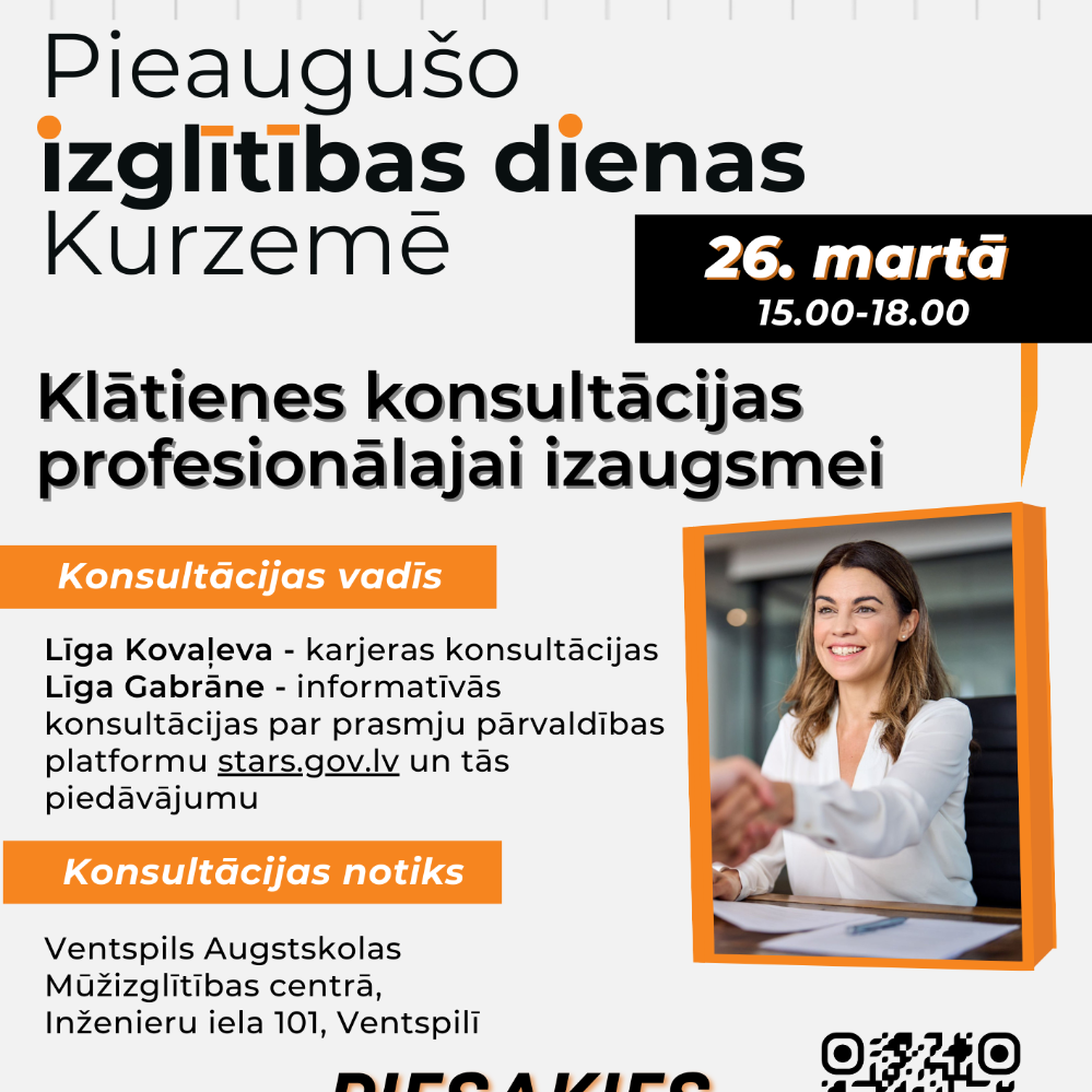 Ventspils Digitālais centrs sadarbībā ar Viedās administrācijas un reģionālās attīstības ministriju (VARAM) aicina ikvienu ventspilnieku pieteikties bezmaksas apmācībām, kur interesenti no 16 gadu vecuma varēs apgūt vai attīstīt digitālās pašapkalpošanās prasmes atbilstoši esošajam zināšanu līmenim. Lai pieteiktos bezmaksas apmācībām, iedzīvotājiem jāaizpilda digitālo prasmju novērtēšanas tests šeit: www.adre.se/zinasanutests. Ailītē pie vēlamās apmācību vietas jānorāda Ventspils valstspilsētas pašvaldība. Interesentiem bez digitālajām prasmēm testu var palīdzēt aizpildīt tuvinieki vai citas uzticības personas, kā arī ikviens var vērsties pēc palīdzības Ventspils Digitālajā centrā, Akmeņu ielā 3. Balstoties uz testa rezultātu, iedzīvotājiem tiks ieteikts piemērotākais līmenis un mācību veids - patstāvīgi tiešsaistē (tālmācība), tiešsaistē pasniedzēja vadībā vai klātienē. Mācības notiek dažādos laikos līdz pat 2026. gada 30.aprīlim. Par konkrētiem mācību laikiem interesēties Ventspils Digitālājā centrā. Par apmācību līmeņiem: Pamata digitālās prasmes – iekļauj pamatzināšanas par datoru un viedtālruni, interneta un e-pasta lietošanu, kā arī drošības pamatus. Pamata digitālās pašapkalpošanās prasmes – koncentrējas uz failu pārvaldību, kritisko domāšanu, medijpratību un internetbankas lietošanu, autorizāciju un elektronisko identifikāciju. Vidējā līmeņa digitālās pašapkalpošanās prasmes – iekļauj zināšanas par e-parakstu, e-pakalpojumiem, e-veselību, elektronisko deklarēšanos sistēmu, pirkumiem internetā un datu aizsardzību. Visu līmeņu apmācības tiks organizētas regulāri, lai ikviens iedzīvotājs varētu mācīties sev ērtākajā laikā. Pēc testa aizpildīšanas ar interesentu sazināsies pašvaldības koordinators, piedāvājot tuvākos brīvos apmācību laikus. Pirmās grupas mācības uzsāks jau janvāra sākumā. Papildu informācija Ventspils Digitālajā centrā, Akmeņu ielā 3, rakstot uz e-pastu [email protected] vai zvanot pa tālruni 63607607. Aktuālā informācija par Digitālā centra piedāvājumu pieejama sociālajos tīklos Facebook un Instagram @vdcentrs, kā arī mājas lapā www.digitalaiscentrs.lv.