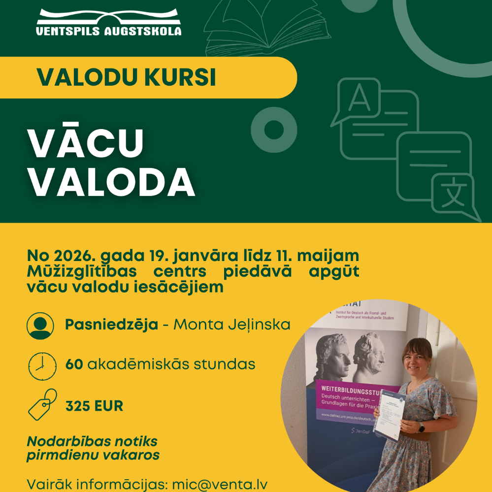 No 19. janvāra līdz 11. maijam aicinām pieteikties vācu valodas iesācēju kursiem pasniedzējas Montas Jeļinskas vadībā. Kurss paredzēts dalībniekiem bez priekšzināšanām vai ar minimālām vācu valodas zināšanām. Kursa laikā dalībnieki apgūs vācu valodas pamatus – izrunu, pamatvārdu krājumu, vienkāršas gramatiskās struktūras un ikdienā lietojamas frāzes, kas nepieciešamas saziņai vienkāršās situācijās. Pieteikšanās:https://venta.lv/muzizglitiba/pieteiksanas/ Papildu informācija: [email protected]