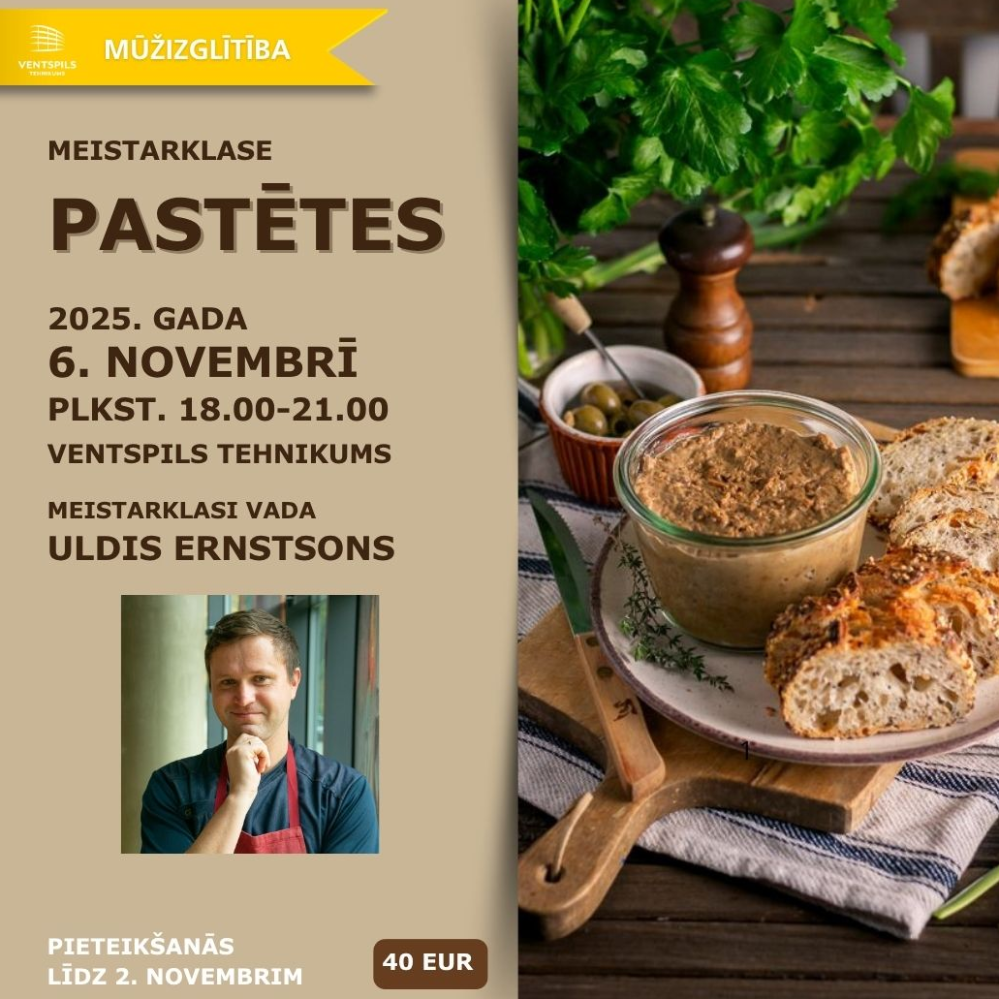 2025. gada 6. novembrī plkst.18.00 Ventspils tehnikumā norisināsies meistarklase “PASTĒTES”. To vadīs Ventspils tehnikuma pedagogs Uldis Ernstsons, kurš dalīsies ar savu pieredzi, receptēm un profesionāliem padomiem, lai katram būtu iespēja izprast pastētes būtību – no tekstūras līdz aromātam. Kā reiz rakstījis Onorē de Balzaks: “Viņš ēda ar lēnu baudu, nogriezdams nelielus gabaliņus no foie gras pastētes, it kā katrs kumoss būtu dārgums, kas jāizbauda līdz pēdējam.” Šī meistarklase būs tieši par to – par garšu, baudīšanu un meistarību. Pastēte ir aukstais ēdiens, ko gatavo no gaļas, zivīm vai citiem produktiem, tos samaļot, pēc tam tiem pievienojot garšvielas un tos saputojot viendabīgā masā. Protams viena no vispopulārākajām pastētēm pasaulē ir franču foie gras, kas gatavota no pīļu aknām un ko uzskata par delikatesi. Bet ne mazāk iecienītas ir arī cita veida pastētes, jo šis ēdiens ir kā lieliska maltīšu sastāvdaļa jebkurā ēdienreizē. Meistarklasē dalībniekiem būs iespēja gatavot četras dažādas pastētes: Klasiskā cūkgaļas aknu pastēte būs lielisks sākums iesācējiem – maiga, krēmīga un gatavota pēc tradicionālas receptes ar sīpoliem, burkāniem, sviestu un garšvielām. Vistu aknu pastēte ar brendiju vai konjaku pārsteigs ar izsmalcinātu, viegli saldenu garšu un samtainu tekstūru, ko pastiprina brendija aromāts. Piparu pastēti ar zaļumiem novērtēs tie, kam patīk izteiktākas garšas – pikanta, ar timiāna, rozmarīna un čili pieskaņu, lieliski piemērota uzkodu galdam vai vīna vakaram. Veģetārā “aknu” pastēte tiks gatavota no sēnēm, pupiņām un valriekstiem – ar pārsteidzoši līdzīgu garšas niansi kā klasiskajām aknu pastētēm. Meistarklase piemērota gan kulinārijas entuziastiem, gan tiem, kas vēlas papildināt savas prasmes. Dalības maksa: 40 eiro Pieteikšanās līdz 2025. gada 2. novembrim, aizpildot pieteikuma anketu – ej.uz/vtmeistarklasepastetes Vietu skaits ir ierobežots!