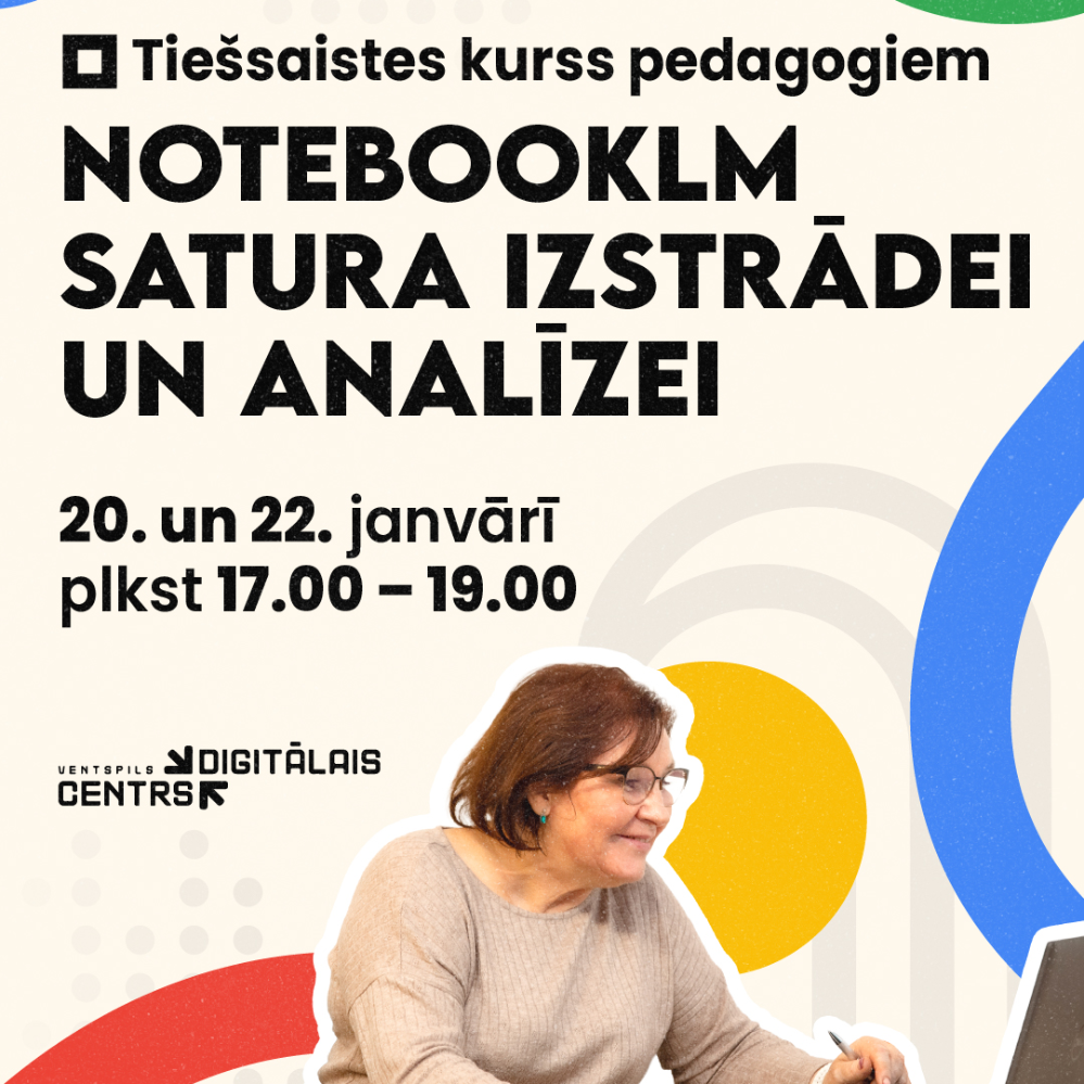 Ventspils Digitālais centrs aicina pedagogus piedalīties tiešsaistes kursā, kur būs iespēja iepazīt NotebookLM — mākslīgā intelekta rīku, kas paredzēts darbam ar lietotāja augšupielādētiem materiāliem. NotebookLM palīdz strukturēt informāciju, analizēt saturu, veidot jautājumus, idejas un kopsavilkumus no dažādiem avotiem. Lai pedagogi varētu efektīvāk plānot darbu un ikdienā ietaupīt laiku, apmācībās uzsvars tiks likts uz praktisku pielietojumu. Apmācības notiks tiešsaistes platformā Zoom 20. un 22. janvārī plkst. 17.30 – 19.00. Pieteikties iespējams līdz 14. janvārim, aizpildot anketu šeit: www.adre.se/anketanotebooklm. Kursa “NotebookLM satura izstrādei un analīzei” programma: Ievads un avotu pārvaldība NotebookLM: NotebookLM iespējas un lietošana; avotu augšupielāde; materiālu strukturēšana. Satura analīze un ģenerēšana: kopsavilkumu veidi; jautājumu ģenerēšana un pārbaude pret avotiem; ideju ģenerēšana un konceptu skiču veidošana. Strukturēts saturs un prezentāciju sagatave: prezentācijas struktūra; vizuālo materiālu ģenerēšana un pielāgošana. Kursa dalībniekiem nepieciešams dators, stabils interneta pieslēgums, aktīvs Google konts, kā arī piekļuve Zoom konferenču programmai. Kursu vadīs Anna Beāte Būmane - Latvijas Universitātes pasniedzēja ar maģistra grādu programmā "Tehnoloģiju inovācijas un dizains izglītībai". Iespējamās Misijas absolvente. Dalības maksa 24,65 EUR. Mācību noslēgumā dalībnieki saņems Ventspils Digitālā centra apliecību. Ja kursa dalībniekam nebūs iespēja pievienoties kādai no tiešsaistes nodarbībām, tad nodarbības ierakstus un mācību materiālus būs iespēja apskatīt Ventspils Digitālā centra mācību platformā, kur tie būs pieejami 6 mēnešus, lai dalībnieki jebkurā laikā varētu atsvaidzināt zināšanas par apgūto Papildu informācija Ventspils Digitālajā centrā, Akmeņu ielā 3, rakstot uz e-pastu [email protected] vai zvanot pa tālruni 63607607. Aktuālā informācija par Digitālā centra piedāvājumu pieejama sociālajos tīklos Facebook un Instagram @vdcentrs, kā arī mājas lapā www.digitalaiscentrs.lv.
