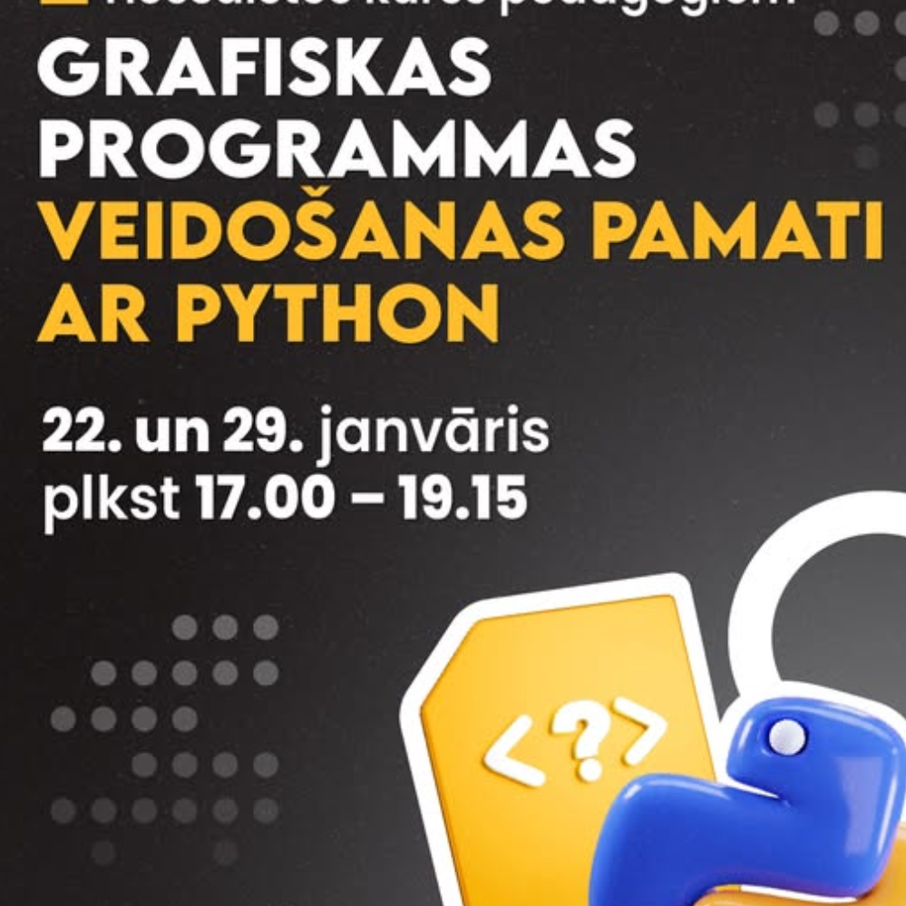 Ventspils Digitālais centrs aicina pedagogus, kuri pasniedz programmēšanas priekšmetus, apgūt teorētiskas un praktiskas iemaņas grafisku Python programmu veidošanā, izmantojot Tkinter bibliotēku. Apmācību dalībnieki iemācīsies izprast Python bibliotēku būtību, atrast un uzstādīt bibliotēkas, lietot dokumentāciju, kā arī apgūs saskarnes pamatus un izveidos grafisku programmu ar interaktīviem elementiem. Apmācību dalībniekiem vēlamas priekšzināšanas: Python pamata sintakse, nosacījumi, cikli. Apmācības notiks tiešsaistes platformā Zoom 22. un 29. janvārī plkst. 17.00 – 19.15. Pieteikties iespējams līdz 18. janvārim, aizpildot anketu šeit: www.adre.se/anketapython. Kursa “Grafiskas programmas veidošanas pamati ar Python” programma: Ievads Python bibliotēkās – to uzstādīšana un izmantošanas iespējas. Ievads Tkinter bibliotēkā – uzstādīšana un pamatklašu izmantošana. GUI veidošanas pamati. Grafiskas programmas veidošana. Praktiskais darbs. Kursa dalībniekiem nepieciešams dators (vēlams ar 2 ekrāniem ērtākām mācībām), stabils interneta pieslēgums, kā arī piekļuve Zoom konferenču programmai. Kursu vadīs Didzis Ābele - Mūžizglītības un Pedagogu profesionālās pilnveides kursu vadītājs, Ventspils Valsts 1. ģimnāzijas datorikas/programmēšanas skolotājs. Dalības maksa 28,80 EUR. Mācību noslēgumā dalībnieki saņems Ventspils Digitālā centra apliecību. Ja kursa dalībniekam nebūs iespēja pievienoties kādai no tiešsaistes nodarbībām, tad nodarbības ierakstus un mācību materiālus būs iespēja apskatīt Ventspils Digitālā centra mācību platformā, kur tie būs pieejami 6 mēnešus, lai dalībnieki jebkurā laikā varētu atsvaidzināt zināšanas par apgūto Papildu informācija Ventspils Digitālajā centrā, Akmeņu ielā 3, rakstot uz e-pastu [email protected] vai zvanot pa tālruni 63607607. Aktuālā informācija par Digitālā centra piedāvājumu pieejama sociālajos tīklos Facebook un Instagram @vdcentrs, kā arī mājas lapā www.digitalaiscentrs.lv.