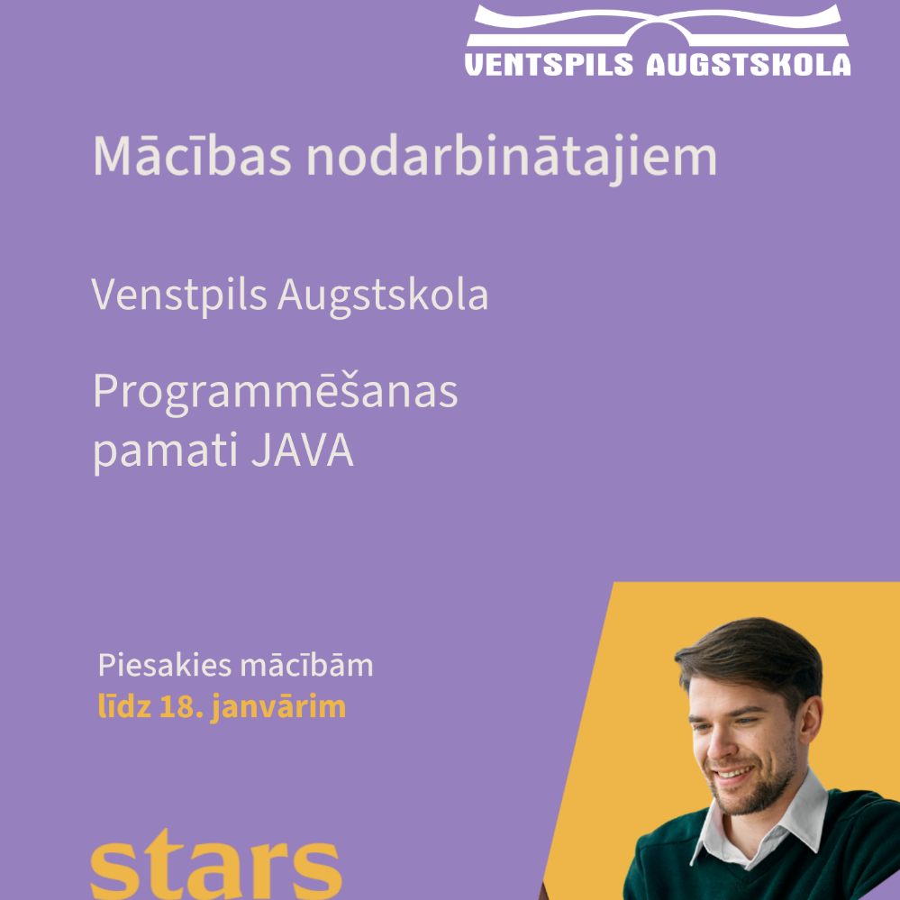 Projektā “Atbalsts pieaugušo individuālajās vajadzībās balstītai pieaugušo izglītībai” Ventspils Augstskola piedāvā studiju kursus, kuros vari apgūt aktuālas zināšanas un prasmes IT jomā. Piesakies mācībām ar 70% Eiropas Savienības līdzfinansējumu! Programmēšana JAVA Kurss paredzēts tiem, kuriem jau ir pamatzināšanas JAVA programmēšanā. Norises laiks: 2026. gada 10. februāris – 2026. gada 31. marts Mācību maksa: Pieteikšanās projektam* ar 30% līdzmaksājumu – 117,42 € Pilna kursa maksa – 391,40 € Pieteikšanās: https://stars.gov.lv/programma/470 Mācībās var piedalīties nodarbinātās personas, kas sasniegušas 18 gadu vecumu *Personām no trūcīgām vai maznodrošinātām mājsaimniecībām, kā arī bēgļiem un personām ar alternatīvo statusu mācības ir bez maksas. Par projektu: https://www.venta.lv/zinatne/projekti/atbalsts-pieauguso-individualajas-vajadzibas-balstitai-pieauguso-izglitibai