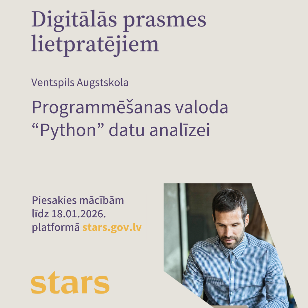 Saņem 500 eiro un mācies “Python” datu analīzei! Ventspils Augstskola platformā stars.gov.lv aicina pieaugušos apgūt studiju kursu “Programmēšanas valoda “Python” datu analīzei”. Platformā stars.gov.lv, izmantojot savu individuālo mācību kontu (IMK), pieaugušajiem vecumā no 18 gadiem tiek piešķirts finansējums 500 eiro apmērā. Ventspils Augstskola piedāvā iespēju apgūt studiju kursu “Programmēšanas valoda “Python” datu analīzei”, jo “Python” ir viena no populārākajām un vieglāk apgūstamajām programmēšanas valodām pasaulē. Tā tiek plaši izmantota uzņēmumos, pētniecībā un valsts pārvaldē datu apstrādei aun analīzei. Ar tās palīdzību iespējams apkopot, sakārtot un analizēt datus, izveidot pārskatus un pieņemt pamatotus lēmumus. Mācības notiks darba dienu vakaros, attālināti, un tās tiks uzsāktas 2026. gada 2. februārī. Pieteikšanās: https://stars.gov.lv/programma/223